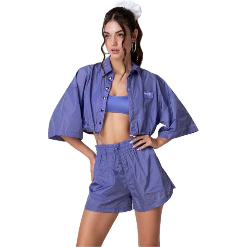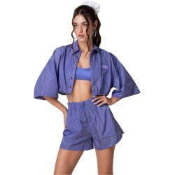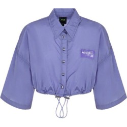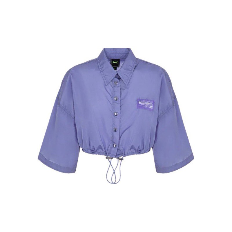 Camicia crop in tessuto nylon viola, con manica 3/4 e coulisse regolabile.