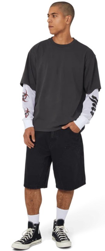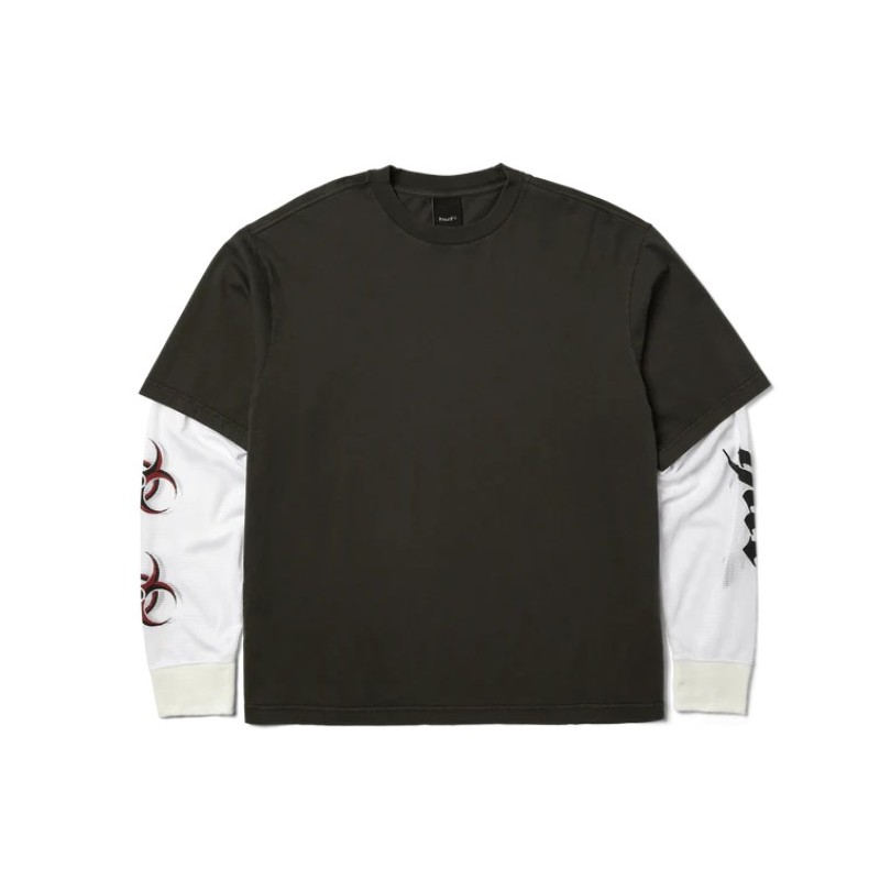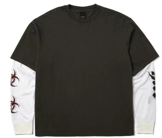 T-shirt HUF Leon Double Layer Top, una t-shirt a maniche lunghe di alta qualità, dal taglio moderno e progettata per durare nel tempo. Un capo essenziale per il guardaroba streetwear, realizzata in cotone lavato a doppio strato con vestibilità boxy e maniche con grafiche stampate. Presenta colletto e polsini a costine 1x1 per una maggiore durata e comfort, e un'etichetta HUF all'interno del collo per un tocco di autenticità.